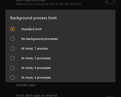 Still in the Developer Options menu, tap on 'Background Process Limit' - this will be preset at 'standard limit', which is what it reverts to every time you power off your Fire.